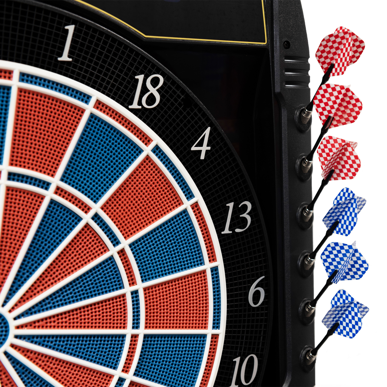 Für authentische Wettkampfatmosphäre verfügt das Softdartboard über digitale Soundeffekte und eine elektronische Stimmansage. Die Lautstärke ist achtfach regelbar. Für effektives Training stehen fünf Computergegner zur Auswahl. Doch auch bis zu 16 Spieler können an vier Spielstandsanzeigen gegeneinander antreten.