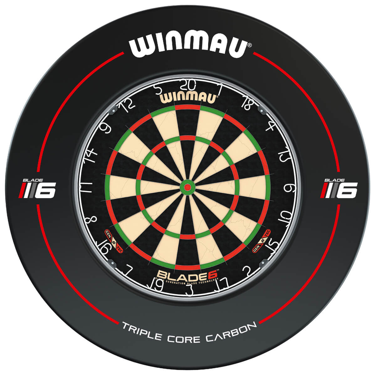 Blade 6 Dartscheibe, da es entsprechend unterstützend bedruckt ist. Der Auffangring reduziert das Herunterfallen von fehlgeleiteten Darts, fängt diese auf und mindert optimal die Geräusche!
