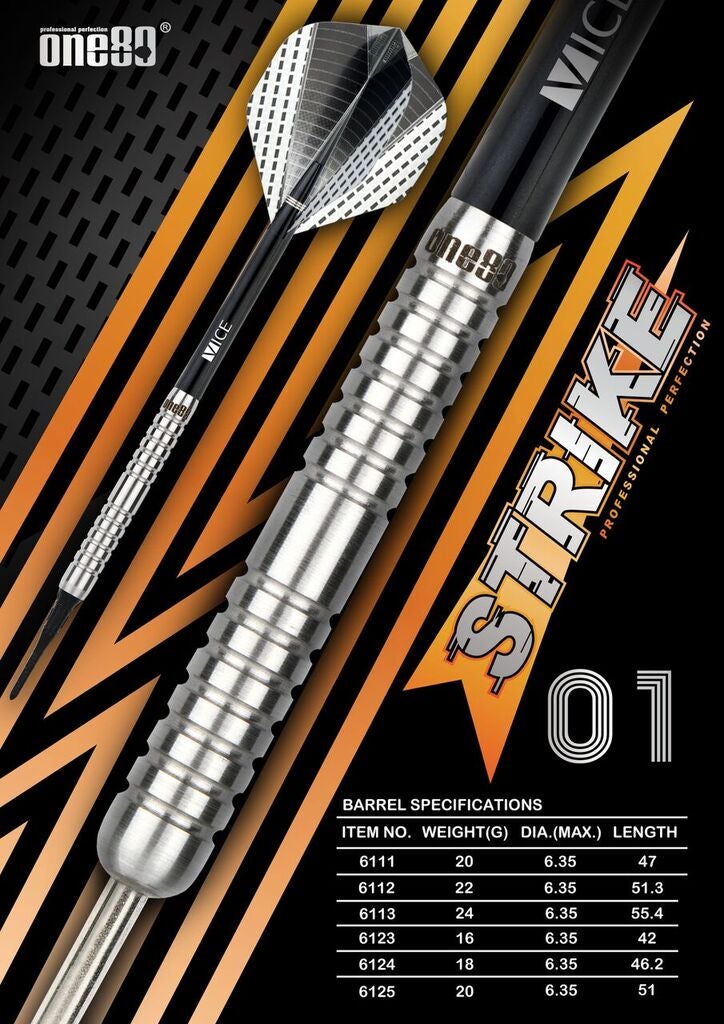 Die Strike Serie von One80 bietet eine Reihe preiswerter Steel- und Softdarts für Anfänger und Fortgeschrittene gleichermaßen. Mit einer Auswahl von sechs unterschiedlichen Barrelformen und unterschiedlichen Gewichten sollte hier jeder das passende Modell für seine Bedürfnisse finden.