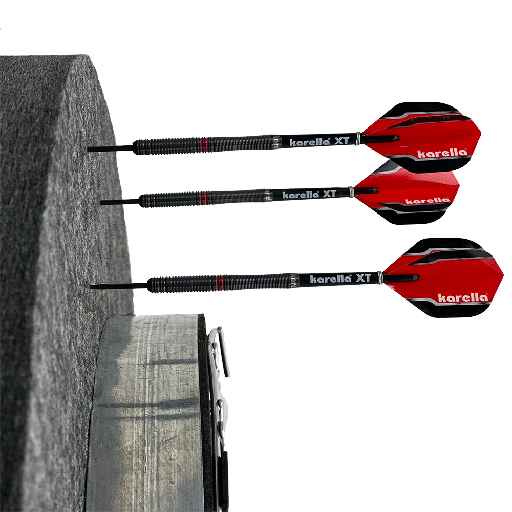 Dartpfeile erzeugen beim Auftreffen auf das Board ein „Klopfgeräusch“. Dieses wird teilweise als sehr störend im eigenen Umfeld oder vom Nachbarn wahrgenommen. Um hier Abhilfe zu schaffen hat Karella - zusammen mit Schallschutzexperten -die perfekte Lösung gefunden, um dieses böse Geräusch fast vollständig zu eliminieren.