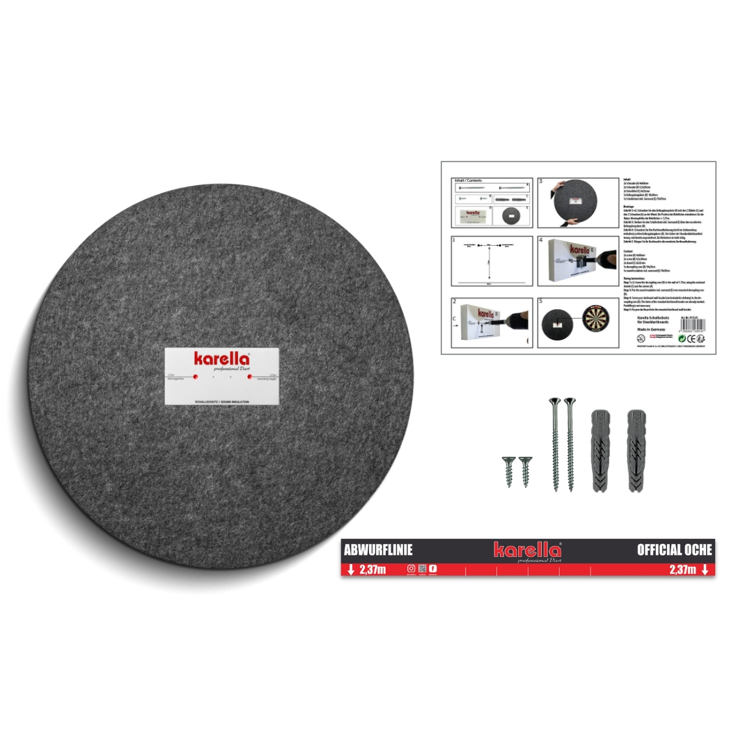 Der zweiteilige Karella Schallschutz besteht aus einem Schallschutzkern - auf dem das Steeldartboard befestigt wird - und einem umgebenen Schallschutzring. Beide Teile werden aus hoch spezialisierten Schallschutzfasern hergestellt. Durch das Zusammenspiel von Schallschutzkern und dem umgebenen Schallschutzring gelingt eine nahezu vollständige Geräuschentkopplung.