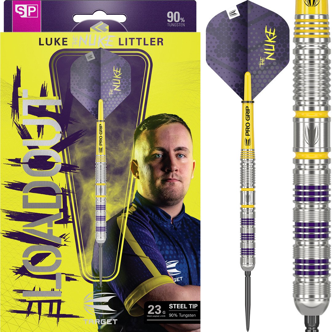 Loadout Darts - Set aus dem Hause Target verfügt über ein gerades Barrel mit ausgewogenem Schwerpunkt, der zusätzlich mit radialen Rillen ausgestattet ist. Der Littler Loadout Swiss Point Steeldart – Barrel ist mit einem Wolfram / Tungsten-Anteil von 90 Prozent produziert.